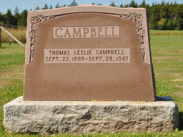 | Burial | He was buried in Geddie Memorial Cemetery, Springbrook, Queens County, Prince Edward Island, Canada, 46.49389, -63.50810G. stone #135. Inscription: CAMPBELL / Thomas Leslie Campbell / Sept. 23, 1899 - Sept. 28, 1947.1 Tombstone, Thomas Leslie Campbell (1899-1947). Geddie Memorial Cemetery, Springbrook, Queens County, Prince Edward Island, Canada. |