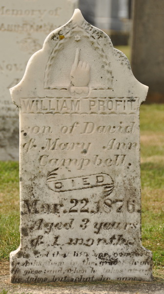 | Burial | He was buried in Geddie Memorial Cemetery, Springbrook, Queens County, Prince Edward Island, Canada, 46.49419, -63.50710G. Inscription: William Profit / son of David / & Mary Ann / Campbell / Died / Mar. 22, 1876, / Aged 3 years / & 1 month.1 Tombstone, William Profit Campbell (1873-1876). Geddie Memorial Cemetery, Springbrook, Queens County, Prince Edward Island. |