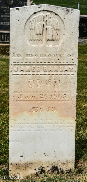 Inscription: In memory of / James Ramsay / Died / Jan. 28, 1865, / Æt. 49.2,3  Tombstone, James Ramsay (1816-1865). Presbyterian/United Cemetery, North Bedeque, Prince County, Prince Edward Island, Canada.