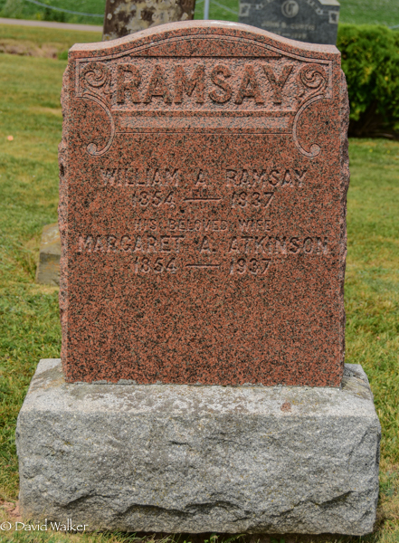 Inscription: RAMSAY / William A. Ramsay / 1854 - 1937 / His Beloved Wife / Margaret A. Atkinson / 1854 - 1937.2,4  Tombstone, William A. Ramsay (1854-1937), his wife Margaret A. Atkinson (1854-1937). Presbyterian/United Cemetery, North Bedeque, Prince County, Prince Edward Island, Canada.