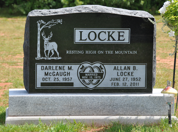 | Burial | He was buried in the Peoples Cemetery, Summerside, Prince County, Prince Edward Island, Canada, 46.40510, -63.77492G. Inscription: LOCKE / Resting high on the mountain / Darlene M. / McGaugh / Oct. 25, 1957 / | Married / Nov. 15, 1975 | Allan B. / Locke / June 27, 1952 / Feb. 12, 2011Back: LOCKE / Parents of Rhonda, Tanya and Chris.3,2 Tombstone, Allan B. Locke (1952-2011), his wife Darlene McGaugh (1957- ). Peoples Cemetery, Summerside, Prince County, Prince Edward Island, Canada.  Back inscription. |