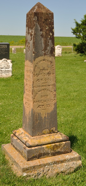 | Burial | He was buried in North Bedeque Cemetery, North Bedeque, Prince County, Prince Edward Island, Canada, 46.36185, -63.72581G. square sandstone obelisk.Inscrption: John Townsend Esq. / Died / Sept. 5, 1880, / AET. 90. / - / Also His Wife / Ann Montgomery / Died / April 11, 1870 / AET. 75. / - /. Left Side: Their Children / Mary / Died / Oct. 1839. / AET. 15. / Hellen / Died / Mar. 27, 1845 / AET. 16. / - /. Right Side: Ann / Townsend / Died / April 11, 1887, / AEt. 67. / Monty Townsend / Died / Jan. 6, 1904, / AEt. 63.3![]() Tombstone, John Townsend (1790-1880)North Bedeque Cemetery, Prince County, Prince Edward Island, Canada. ![]() Front inscription detail. ![]() Left side inscription detail. ![]() Right side inscription detail. |