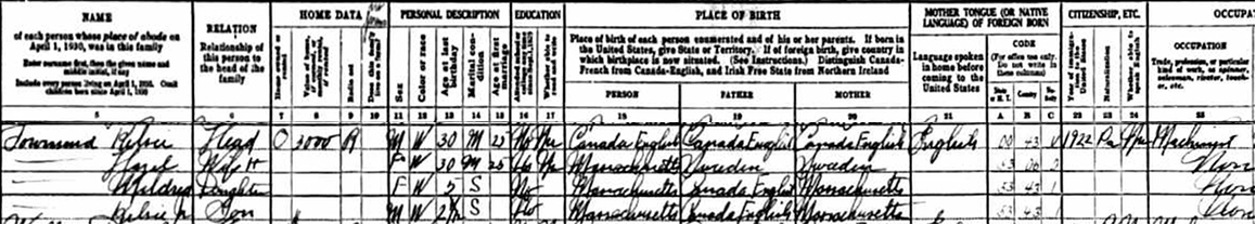 | Census | He was head of the household in the census on 23 April 1930 in Milford, Worcester County, Massachusetts, USAG. included in the household with Kelsie (age 30) were his wife Hazel (age 30), and children Mildred (age 5) and Kelsie (age 2 years, 1 month). Kelsie was a machinist.5 1930 US Census, Milford, Worcester County, Massachusetts. Household of Kelsie Townsend, his wife Hazel, and their children Mildred and Kelsie. |