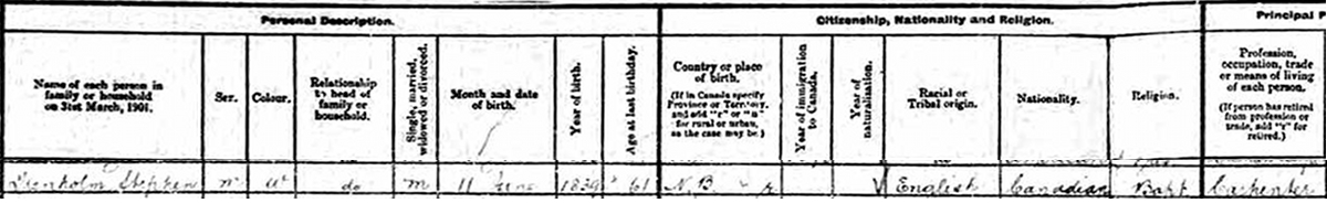 | Census | She was head of the household in the census in 1891 in Westmorland Parish, Westmorland County, New BrunswickG.2,1 |