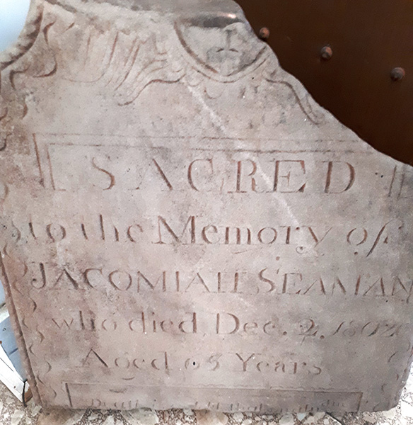 Inscription: Sacred / to the Memory of / Jacomiah Seaman / who died Dec. 2, 1802 / Aged 65 Years.20  Cemetery marker, found in a farmer's field, West Pugwash, Cumberland County, Nova Scotia. Jacomiah Seaman Sr. (c1735-1802). Photo courtesy of the North Cumberland Historical Society.