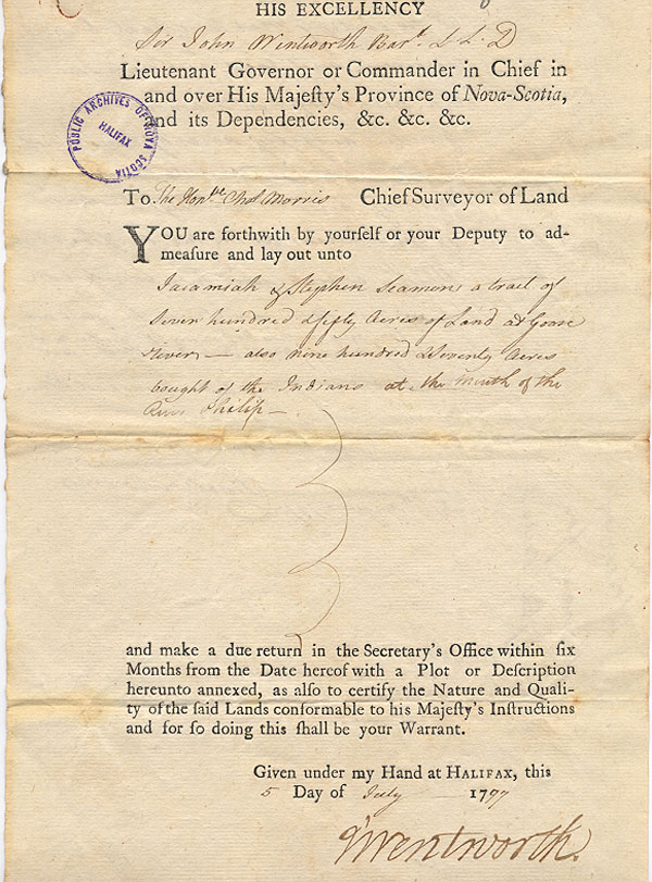 - [S3971] Warrant to Survey, Surveyor's Report - Stephen Seaman (Halifax, Nova Scotia: Surveyor's Certificate, 1785). Hereinafter cited as Surveyor's Report - Stephen Seaman.