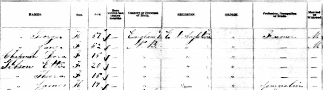 | Witness | She was enumerated on the census in 1881 in the household of George Gibson in Moncton Parish, Westmorland County, New Brunswick, CanadaG. included in the household with George (age 67) his third wife Jane (age 52), and George's children by his second wife Catherine, Henrietta 'Ettie' (age 20), Theora (age 16) and son James (age 19). There was also Dora Chapman (age 16), unknown relationship. George was Anglican, his wife Jane and daughters were Baptists.2 1881 Canada Census, Moncton Parish, Westmorland County, New Brunswick. Household of George Gibson, his third wife Jane, children by his second wife Catherine, Ettie/Henrietta, Theora and James, and Dora Chapman (unknown relationship). |