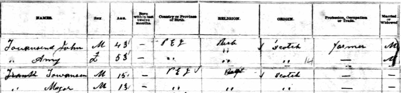 | Census | He was head of the household in the census on 25 April 1901 in Lot 19, Prince County, Prince Edward Island, CanadaG. included in the household with Thomas (age 66) were his wife Amy Green (age 58), their children Colin (age 31), Albenia (age 27) and Annie (age 24). Thomas and Colin were farmers. The family religion was Presbyterian.5 1901 Canada Census, Lot 19, Prince County, Prince Edward Island. Household of Thomas Townsend, his wife Amy Green, their children Colin, Albenia and Annie. |