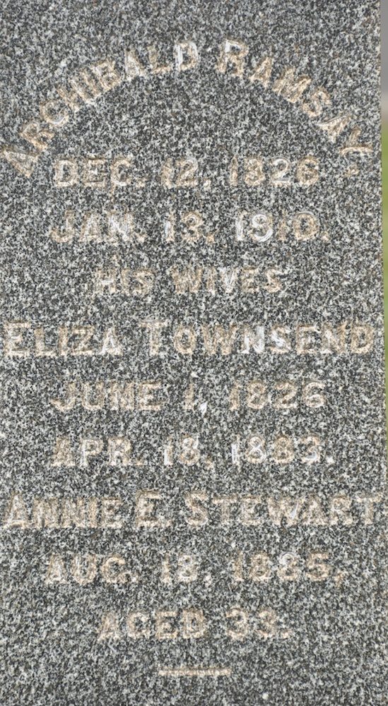 Inscription: Archibald Ramsay / Dec. 12, 1826 / Jan. 13, 1910. / His Wives / Eliza Townsend / June 1, 1826, Apr. 18, 1883 / Annie E. Stewart / Aug. 18, 1885. / Aged 33 / - / RAMSAY.Rear: Thomas L. Ramsay / Dec. 8, 1862 / July 28, 1958 / And His Wife / Fannie McGougan / June 20, 1859 / Oct. 1, 1951 / -.3,1  Tombstone, Archibald Ramsay (1826-1910), his wives Eliza Townsend (1826-1883) and Annie E. Stewart (1852-1885, his son by Eliza, Thomas L. Ramsay (1862-1958), and his wife Fannie McGougan (1859-1951), Peoples Cemetery, Malpeque, Prince County, Prince Edward Island.  Back inscription detail.  Front inscription detail.
