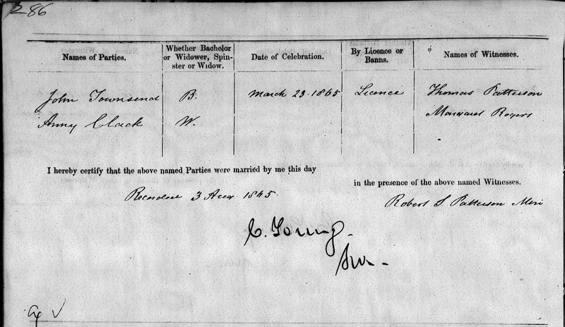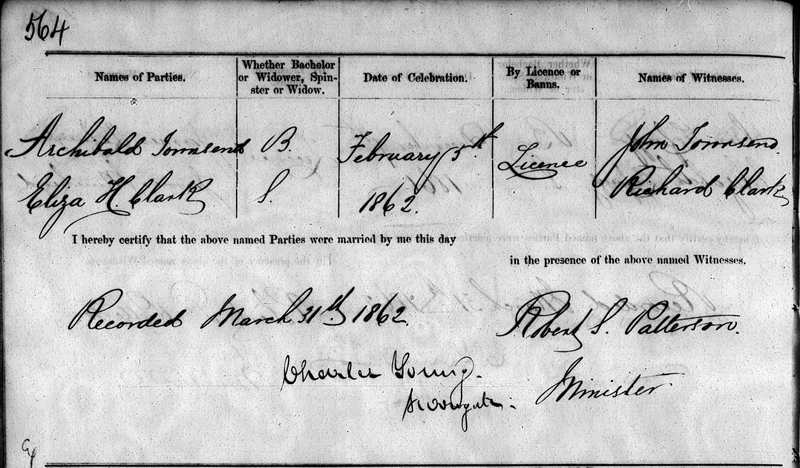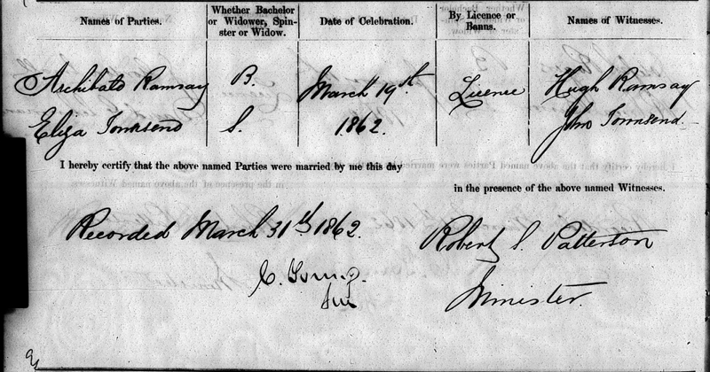 | Marriage | Archibald Ramsay married first Eliza Townsend daughter of John Townsend and Nancy Ann Montgomery, on 19 March 1862 in Prince County, Prince Edward Island, CanadaG, Archibald Ramsay (B)Eliza Townsend (S)Date of Celebration March 19th 1862 by licenseWitnesses: Hugh Ramsay & John TownsendRecorded March 31st 1862Married by Rev. Robt. S. Patterson, by license, recorded 31 March 1862.1,4 Marriage Registration, Archibald Ramsay and Eliza Townsend. |