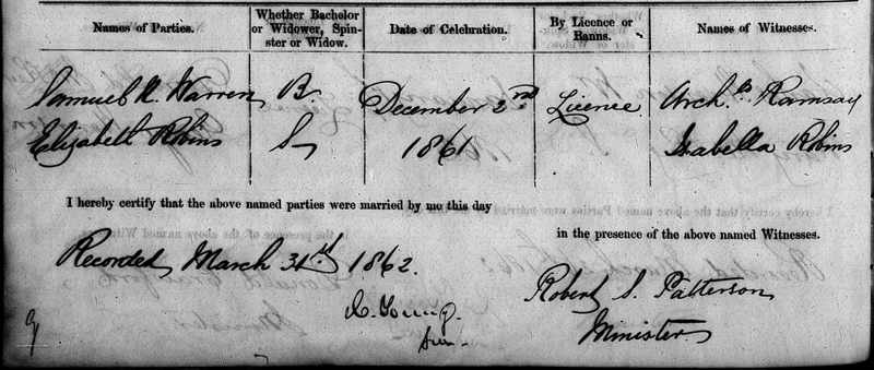 - [S6925] , (2 December 1861), Prince Edward Island Marriage Registers, 1832-1888 (1861-1863), Page 562, Image 21, Samuel Warren & Elizabeth Robins. Hereinafter cited as Prince Edward Island Marriage Registers.