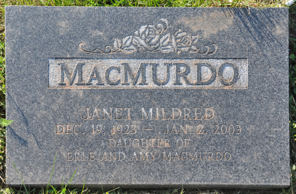| Burial | She was buried on 5 January 2003 in North Bedeque Cemetery, North Bedeque, Prince County, Prince Edward Island, Canada, 46.36205, -63.72555G. flat stone, inscription: MACMURDO / Janet Mildred / Dec. 19, 1923 - Jan. 2, 2003 / Daughter of / Erle and Amy MacMurdo.1,3![]() Tombstone, Janet Mildred MacMurdo (?-2003)North Bedeque Cemetery, Prince County, Prince Edward Island. |