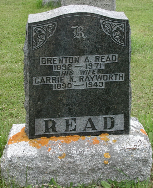 | Burial | He was buried in Point de Bute Cemetery, Point de Bute, Westmorland County, New Brunswick, CanadaG. Inscription: Brenton A. Read / 1892 - 1971 / His Wife / Carrie K. Rayworth / 1890 - 1943 / READ.1 Tombstone, Brenton A. Read (1892-1971) and his wife Carrie K. Rayworth (1890-1943). Point de Bute Cemetery, Point de Bute, Westmorland County, New Brunswick, Canada. |