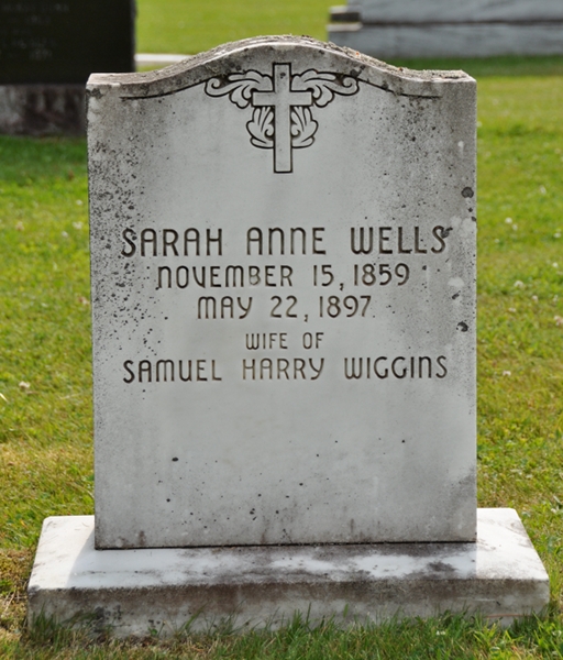 Inscription: Sarah Ann Wells / November 15, 1859 / May 22, 1897 / Wife of Samuel Harry Wiggins.1,5  Tombstone, Sarah Anne Wells (1859-1897). St. Peter's Anglican Cemetery, Alberton, Prince County, Prince Edward Island.