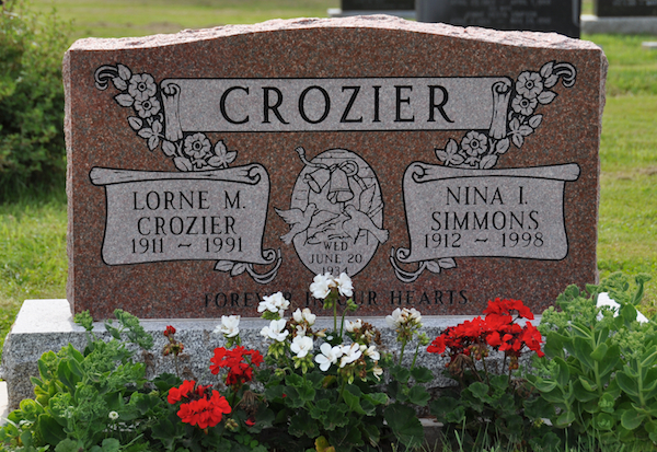 Inscription Front: CROZIER / Lorne M. / Crozier / 1911 - 1991 | Wed / June 20 / 1934 | Nina I. / Simmons / 1912 - 1998 // Forever in Our Hearts.5  Tombstone, Lorne Marchbank Crozier (1911-1991), his wife Nina Isabelle Simmons (1912-1998). Peoples Cemetery, Kensington, Prince County, Prince Edward Island, Canada.