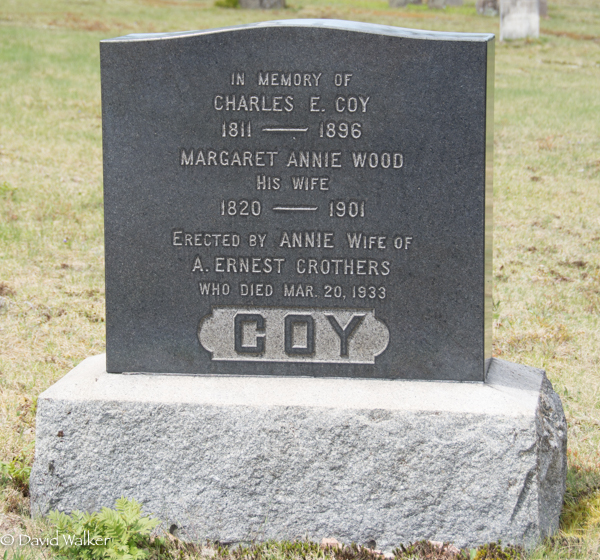- [S12189] Cemetery marker, Upper Gagetown Cemetery, Upper Gagetown, Queens County, New Brunswick, Canada. Charles E. Coy Sr. & Margaret Annie Wood, tombstone inscription & photograph; read by David A. Walker, 16 May 2017.