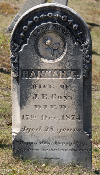 Inscription: Gone Home / Hannah E. / Wife of / J. E. Coy, / Died / 17th Dec. 1874 / Aged 28 years. / Happy day, happy day / Then Jesus washed my sins away.3  Marker, Hannah E. (Cowperthwaite) Coy (1846-1874). Upper Gagetown Cemetery, Upper Gagetown, Queens County, New Brunswick, Canada.  Footstone.