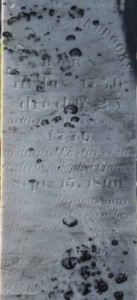 | Burial | He was buried in Upper Gagetown Cemetery, Upper Gagetown, Queens County, New Brunswick, 45.84641, -66.24098G. Inscription: Rev. Elijah Estabrooks / Born / in Mass. 1756, / died 1825. / Settled in Waterboro / 1776, / ordained Pastor of the / Waterboro Baptist Church / Sept. 15, 1800. / ESTABROOKS.1,4 ![]() Tombstone, Rev. Elijah Estabrooks II (1756-1825), his wife Mary Whittemore (1761-1824). Upper Gagetown (Baptist) Cemetery, Queens County, New Brunswick, Canada. ![]() Front inscription. ![]() Right inscription. |