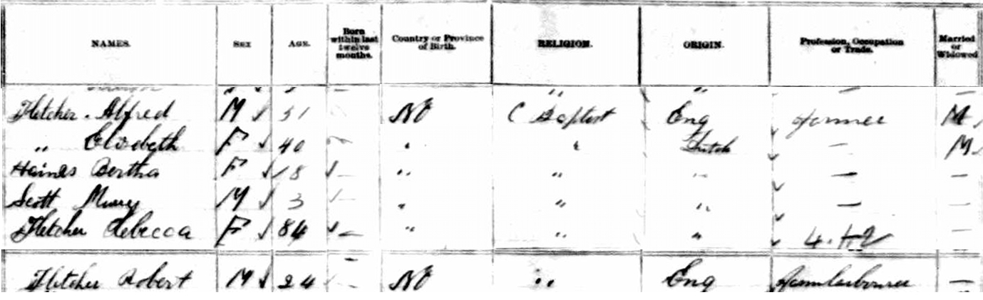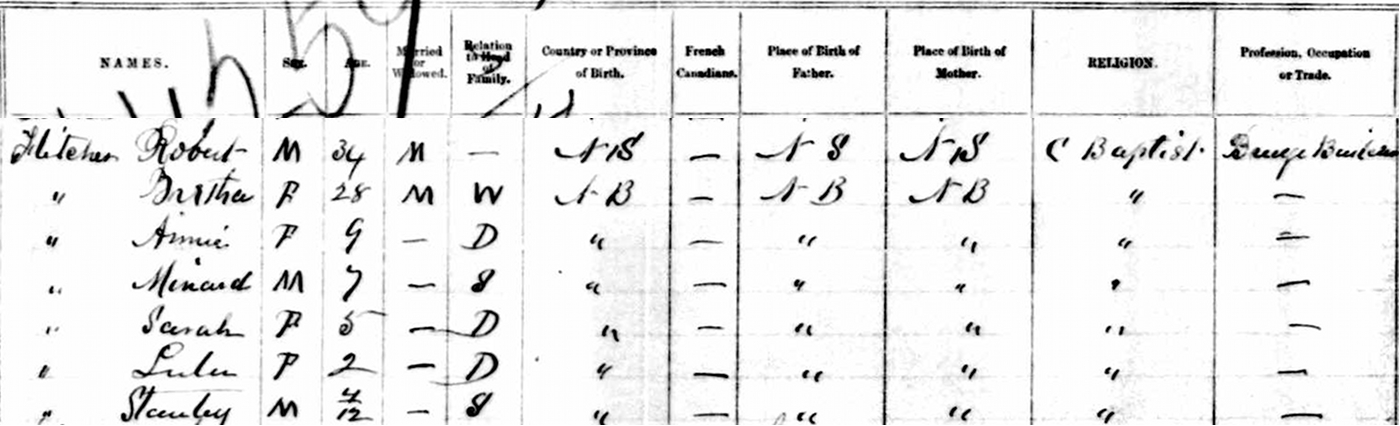 | Witness | He was enumerated on the census in 1881 in the household of Alfred Fletcher in St. Marys, York County, New Brunswick, CanadaG. included in the household with Alfred (age 51) were his wife Elizabeth (age 40), mother Rebecca (age 84), nephew Robert (age 24), and Robert's future wife, Bertha Haines (age 18). There was also a third unknown child, Murray Scott (age 3). Alfred was a farmer, Robert a farm labourer.4![]() 1881 Canada Census, St. Marys, York County, New Brunswick. Household of Alfred Fletcher, his wife Elizabeth, Alfred's mother Rebecca, his nephew Robert, and Robert's future wife, Bertha Haines. |