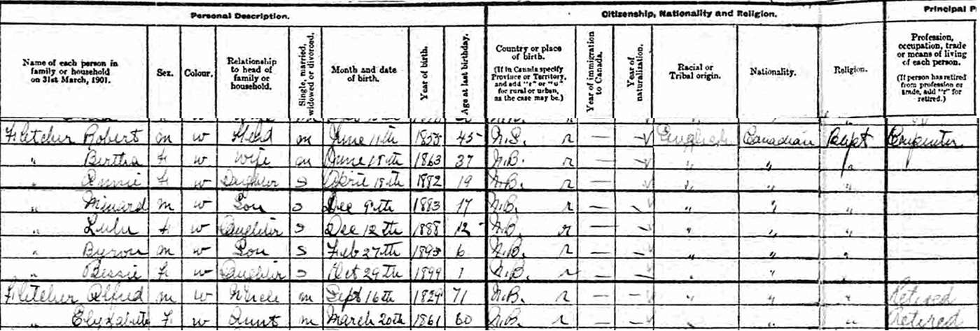| Census | He was head of the household in the census on 29 April 1901 in St. Marys, York County, New Brunswick, CanadaG. included in the household with Robert (age 45) were his wife, Bertha Haines (age 37), children Annie (age 19), Minard (age 17), Lulu (age 12), Byron (age 6) and Bessie (age 1). Also in the household were Robert's uncle, Alfred Fletcher (age 71) and his wife Elizabeth (age 60). Robert was a carpenter. The family religion was Baptist.7![]() 1901 Canada Census, St. Marys, York County, New Brunswick. Household of Robert Fletcher, his wife Bertha Haines, their children, Annie, Minard, Lulu, Byron and Bessie. Also in the household were his uncle Alfred Fletcher and his wife Elizabeth. |