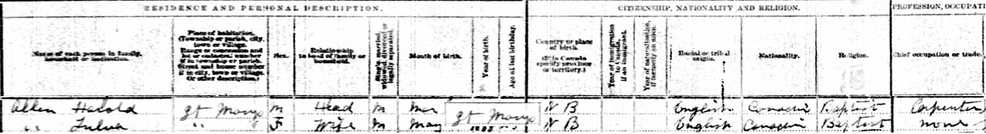 | Census | Harold Alexander Allen was head of the household in the census in 1911 in St. Marys, York County, New Brunswick, CanadaG. included in the household with Harold (age 23) was his wife, Lulu Fletcher(age 23). Harold was a carpenter. They were both Baptists.3![]() 1911 Canada Census, St. Marys, York County, New Brunswick. Household of Harold Allen and his wife, Lulu Fletcher. |