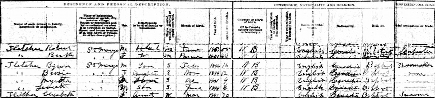 | Census | He was head of the household in the census in 1911 in St. Marys, York County, New Brunswick, CanadaG. included in the household with Robert (age 55) were his wife, Bertha Haines (age 49), children Byron (age 16), Bessie (age 12), Myrtle/Merville (age 9), Leverett (age 6). Also in the household was Robert's widowed aunt Elizabeth (age 70). Robert was a carpenter, Byron a shoemaker. The family religion was Baptist.9![]() 1911 Canada Census, St. Marys, York County, New Brunswick. Household of Robert Fletcher, his wife Bertha Haines, their children Byron, Bessie, Myrtle/Merville and Leverett, and Robert's aunt Elizabeth (by marriage). |
