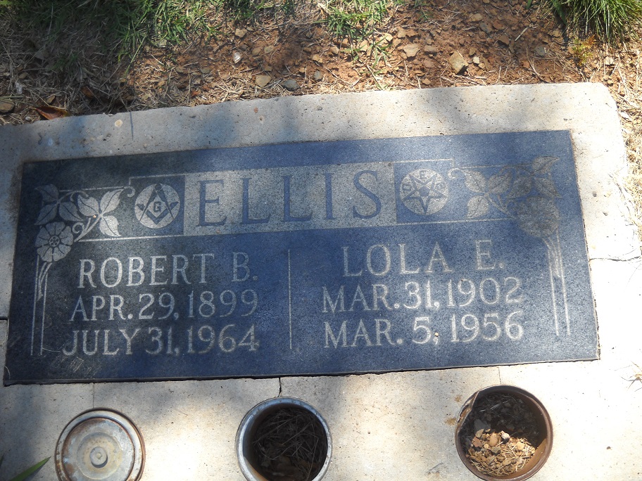 Inscription: ELLIS / Robert B. / Apr. 29, 1899 / July 31, 1964 | Lola E. / Mar. 31, 1902 / Mar. 5, 1956.2  Marker, Robert Ellis (1899-1964) and Lola E. Coy (1902-1956). Submitted by Valarie Vine, findagrave.com