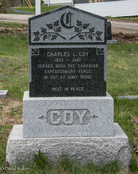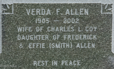 | Burial | She was buried in the in the Baptist Cemetery, Upper Gagetown, Queens County, New Brunswick, Canada, 45.84615, -66.24174G. Inscription: Charles L. Coy / 1875 - 1947 / Served with the Canadian / Expiditionary Force / in 1917 at Vimy Ridge / Rest in Peace / COYBack: Verda F. Allen / 1905 - 2002 / Wife of Charles L. Coy / Daughter of Frederick / & Effie (Smith) Allen / COY.5 ![]() Tombstone, Charles L. Coy (1875-1947), his wife Verda F. Allen (1905-2002). Upper Gagetown (Baptist) Cemetery, Queens County, New Brunswick, Canada. ![]() Back inscription detail. ![]() Flatstone, Charles L. Coy. ![]() Flatstone, Verda (Allen) Coy. |