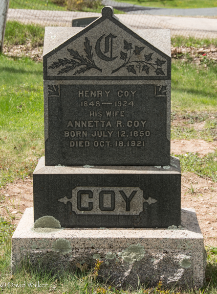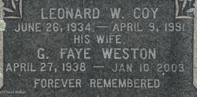 | Principal 2 | She was buried in the in Upper Gagetown Cemetery, Queens County, New Brunswick, Canada, 45.84613, -66.24172G. Inscription: Henry Coy / 1848 - 1924 / His Wife / Annetta R. Coy / Born July 12, 1850 / Died Oct. 18, 1921 / COYRight: Charles L. / May 8, 1875 / Feb. 2, 1947Back: Leonard W. Coy / June 26, 1934 - April 9, 1991 / His Wife / G. Faye Weston / April 27, 1938 - Jan. 10, 2003 / Forever Remembered.2 ![]() Tombstone, Henry Coy (1847-1924), his wife Annetta R. Harding (1850-1921), their son Charles L. Coy (1875-1947), their grandson Leonard W. Coy (1934-1991), his wife Faye Weston (1938-2003). Upper Gagetown (Baptist) Cemetery, Queens County, New Brunswick, Canada. ![]() Right inscription detail. ![]() Back inscription detail. ![]() Flatstone, Leonard Coy. ![]() Flatstone, Faye (Weston) Coy. |