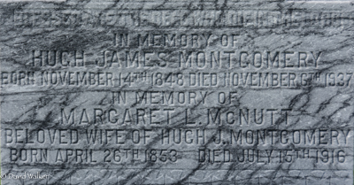 Inscription: In Memory of / Hugh James Montgomery / Born November 14th 1848 - Died November 6th 1937 / In Memory of / Margaret L. McNutt / Beloved Wife of Hugh J. Montgomery / Born April 26th 1853 - Died July 15th 1916Right: In Memory of / Ellen Montgomery / Born / August 15th 1845 / Died / September 30th 1931.3,2  Marker, Hugh James Montgomery (1848-1937), his wife Margaret L. MacNutt (1853-1916), his sister Ellen Montgomery (1845-1931). Geddie Memorial Cemetery, Springbrook, Queens County, Prince Edward Island, Canada.  Front inscription detail.  Right inscription detail.