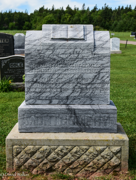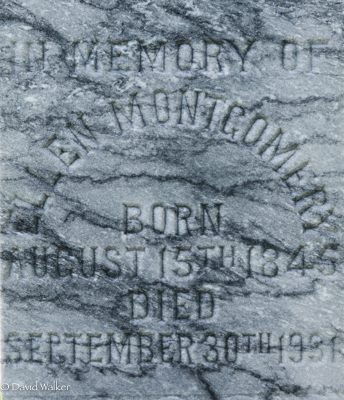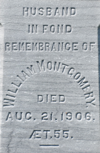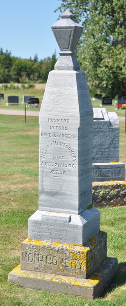 | Burial | He was buried in Geddie Memorial Cemetery, Springbrook, Queens County, Prince Edward Island, Canada, 46.49433, -63.50757G. stone #377. Inscription: Husband / In fond / remembrance of / William Montgomery / Died / Aug. 21, 1906 / AET. 55 / Sleep on beloved sleep / And take thy rest, / We loved thee well / But Jesus loves thee best / MONTGOMERY Right: Wife / In fond / Remembrance of / Penelope Anne Cousins / Died / Sept. 22, 1943, / AEt. 69. / Asleep in Jesus.3 Tombstone, William Montgomery (c.1851-1906), his wife Penelope Anne Cousins (1874-1943). Geddie Memorial Cemetery, Springbrook, Queens County, Prince Edward Island, Canada.  Front inscription detail.  Right inscription detail. |
