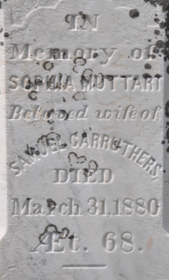 - [S9728] Cemetery Marker. Samuel Carruthers & Sophia Muttart, Marker Inscription; read by David A. Walker, 4 August 2014.