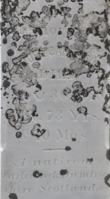 Inscription: In / Memory of / Sophia Muttart / Beloved Wife of / Samuel Carruthers / Died / March 31, 1880 / Æt. 68Right: In / Memory of / Samuel Carruthers / Died / Nov. 30, 1875 / Æt. 73 Yrs. / & 10 Mo's / A native of / Carlevereck (sic) Dumfrie / shire Scotland.3  Tombstone, Samuel Carruthers (1802-1875), his wife Sophia Muttart (1812-1880). North Bedeque Cemetery, Prince County, Prince Edward Island, Canada.  Front inscription detail.  Right inscription detail.