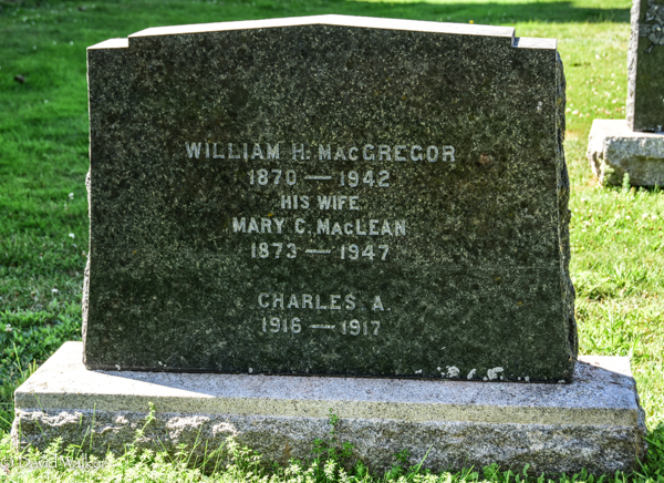 Inscription: William H. MacGregor / 1870 - 1942 / His Wife / Mary C. MacLean / 1873 - 1947 / Charles A. / 1916 - 1917.4  Tombstone, William H. MacGregor (1870-1942), his wife Mary C. MacLean (1873-1947), their son Charles A. MacGregor (1916-1917). Central Lot 16 United Church Cemetery, Prince County, Prince Edward Island, Canada.