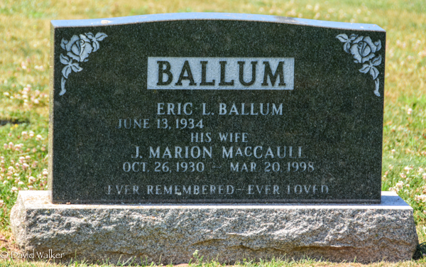 Inscription: BALLUM / Eric L. Ballum / June 13, 1934 - / J. Marion MacCaull / Oct. 26, 1930 - Mar. 20, 1998 / Ever Remembered - Ever Loved.2,3  Tombstone, Eric L. Ballum (1934- ), his wife J. Marion MacCaull (1930-1998). Presbyterian/United Cemetery, North Bedeque, Prince County, Prince Edward Island, Canada.