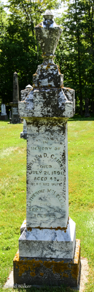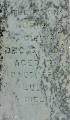 Inscription: In / memory of / William D. Cairns / Died / July 21, 1891 / Aged 43 / Also His Wife / Catherine McLellan / Died / Sept. 16, 1910, / Aged 60Right: Their son / Orin / Died / Dec. 31, 1896 / Aged 13 / Daughter / Lulu / Died / [No date inscribed].2  Tombstone, William D. Cairns (1848-1891), his wife Catherine McLellan (1850-1910), their children Orin (1883-1896) and Lulu (no dates inscribed). United Baptist Cemetery, Central Bedeque, Prince County, Prince Edward Island, Canada.  Front inscription detail.  Right inscription detail.