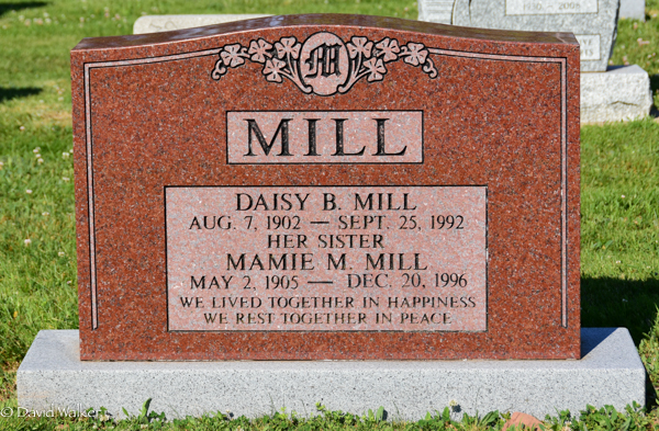 Inscription: MILL / Daisy B. Mill / Aug. 7, 1902 - Sept. 25, 1992 / Her Sister / Mamie M. Mill / May 2, 1905 - Dec. 20, 1996 / We lived together in happiness / We rest together in peace.2  Tombstone, Daisy B. Mill (1902-1992), her sister Mamie M. Mill (1905-1996). Peoples Cemetery, Kensington, Prince County, Prince Edward Island, Canada.