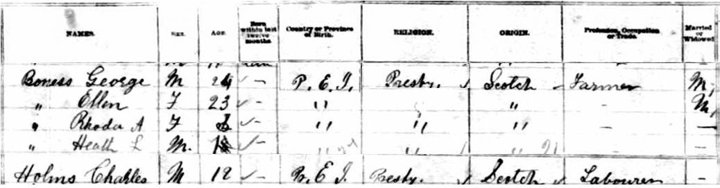 | Wife | She was enumerated on the census in 1881 in the household of George Bowness, as his wife, in Lot 25, Prince County, Prince Edward Island, CanadaG. Enumerated in the household with George (age 24) were his wife Ellen Glover (age 23), daughter Rhoda (age 3) and son Heath (age 1). George was a farmer. The family religion was Presbyterian. Also in the household was Charles Holmes (age 18), a labourer.8![]() 1881 Canada Census, Lot 25, Prince County, Prince Edward Island. Household of George Bowness, his wife Ellen Glover, their children, Rhoda and Heath. |
