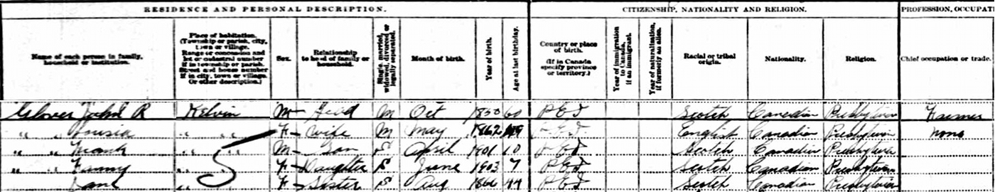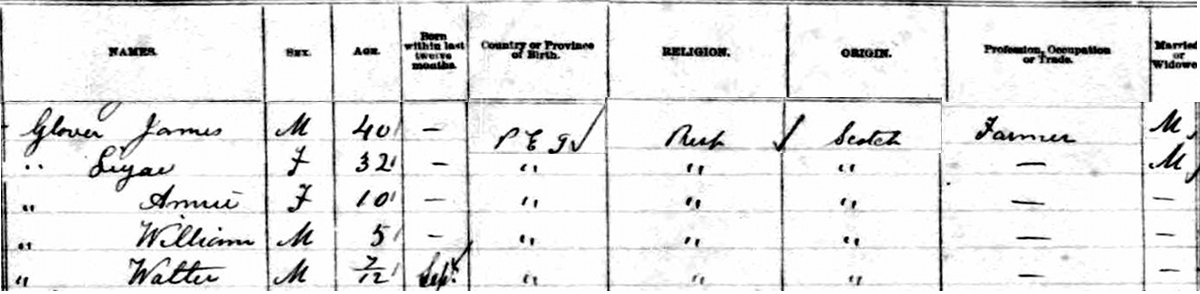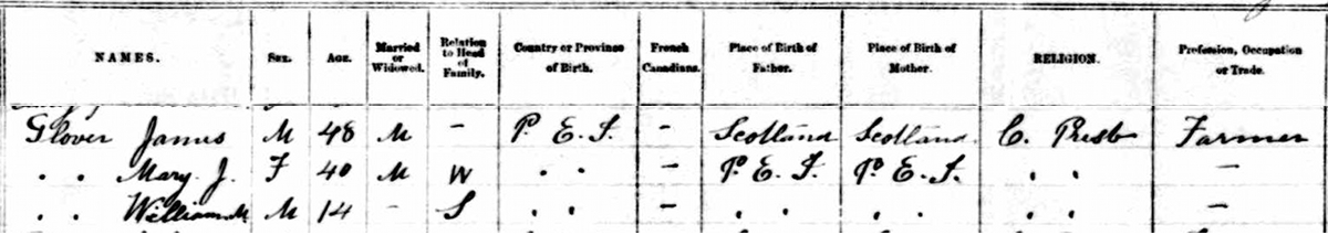 | Census | He was head of the household in the census on 17 April 1891 in Lot 19, Kelvin Grove, Prince County, Prince Edward Island, CanadaG. Enumerated in the household with James (age 48) were his second wife Mary (age 40), his son (by first marriage to Eliza Silliker), William (age 14). James was a farmer. The family religion was Presbyterian. They lived between his sister Sarah & Edward Walker on one side, and James's parents, John Glover & Margaret (Marchbank) and sisters Margaret Jane and Mary.7![]() 1891 Canada Census, Lot 19, Prince County, Prince Edward Island. Household of James Glover, his second wife Mary J. Dickison, his son William by his first marriage. |