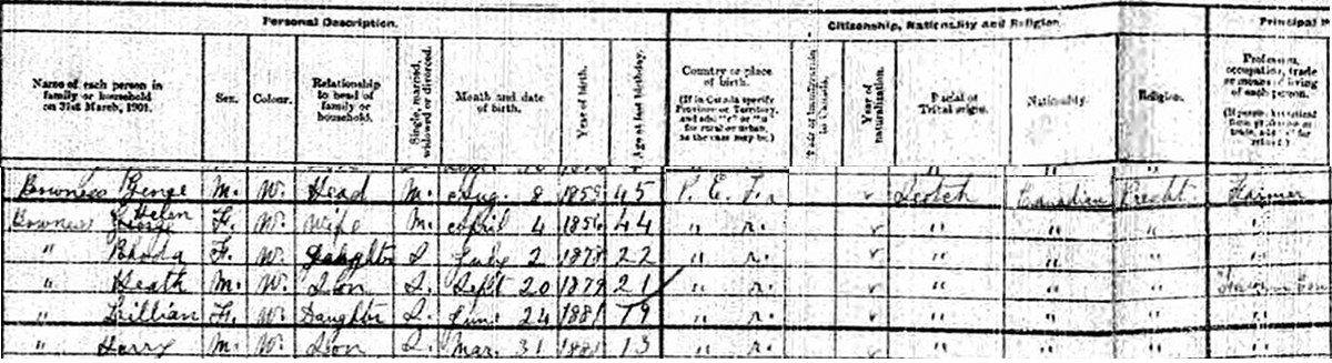 | Census | He was head of the household in the census on 31 March 1901 in Lot 25, Prince County, Prince Edward Island, CanadaG. Enumerated in the household with George (age 45) were his wife Helen Glover, children Rhoda (age 22), Heath (age 21), Lillian (age 19) and Harry (age 13). George was a farmer, Heath a farmer's son. The family religion was Presbyterian.2![]() 1901 Canada Census, Lot 25, Prince County, Prince Edward Island. Household of George Bowness, his wife Helen Glover, their children, Rhoda, Heath, Lillian and Harry. |