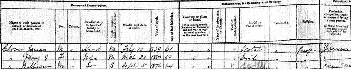 | Wife | She was enumerated on the census on 28 May 1901 in the household of James Glover, as his wife, in Lot 19, Kelvin Grove, Prince County, Prince Edward Island, CanadaG. Enumerated in the household with James (age 61) were his second wife Mary (age 50), his son (by first marriage to Eliza Silliker), William (age 24). James was a farmer, William a farmer's son. The family religion was Presbyterian. They lived on the farm adjacent to Edward Walker on the Blue Shank Road.2![]() 1901 Canada Census, Kelvin Grove, Lot 19, Prince County, Prince Edward Island. Household of James Glover, his wife Mary Dickison, James's son William by his first marriage. |