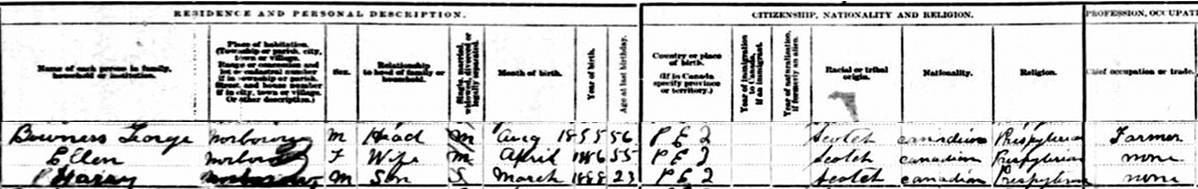 | Census | He was head of the household in the census in 1911 in Lot 25, Norboro, Prince County, Prince Edward Island, CanadaG. Enumerated in the household with George (age 56) were his wife Helen Glover (age 55), and son Harry (age 23). George was a farmer. The family religion was Presbyterian. Their son Heath lived on the adjacent farm.6![]() 1911 Canada Census, Norboro, Lot 25, Prince County, Prince Edward Island. Household of George Bowness, his wife Helen Glover, their son Harry. |