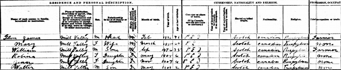 | Census | He was head of the household in the census in 1911 in Lot 25, Mill Valley, Prince County, Prince Edward Island, CanadaG. Enumerated in the household with James (age 71), were his wife Mary (age 68), his son by his first marriage, William (age 35), now a widower, and William's children, Robina (age 6), Jean (age 4) and Walter (age 2). James and William were farmers. The family religion was Presbyterian.8![]() 1911 Canada Census, Mill Valley, Lot 25, Prince County, Prince Edward Island. Household of James Glover, his wife Mary Dickison, his son William, now a widower, and William's children Robina, Jean and Walter. |