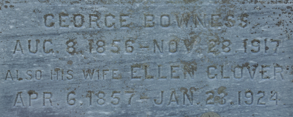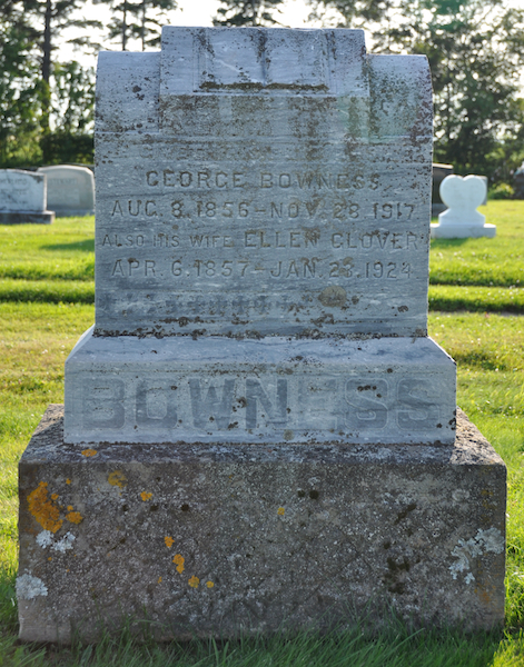 | Burial | He was buried in the Peoples Cemetery, Kensington, Prince County, Prince Edward Island, Canada, 46.44755, -63.62903G. Inscription: George Bowness / Aug. 8, 1856 - Nov. 28, 1917 / Also His Wife Ellen Glover / Apr. 6, 1857 - Jan. 23, 1924 / BOWNESS.3 ![]() Tombstone, George Bowness (1856-1917), his wife Helen/Ellen Glover (1857-1924). The Peoples Cemetery, Kensington, Prince County, Prince Edward Island. ![]() Front inscription detail. |