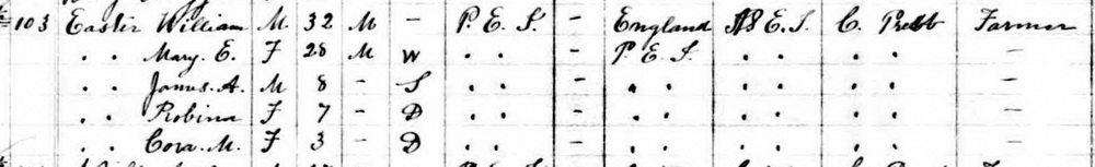 - [S3351] Canada 1891 Census, Lot 19, Prince County, Prince Edward Island, household #103 of William Easter, 17 April 1891, digital copy of original document, LAC microfilm T-6383, Page 24. District #134. Library & Archives Canada, Library & Archives Canada; 395 Wellington St., Ottawa,, Ontario, Canada.