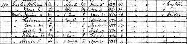 | step-son | James Allan Walker was enumerated on the census on 25 May 1901 in the household of William Keir Easter, as a step-son, in Lot 19, Prince County, Prince Edward Island, CanadaG.3 1901 Canada Census, household of William Keir Easter and Mary Ellen Found. Included in the household were children from Mary's first marriage to Robert Walker, and children from her second marriage to William Easter. Lot 19, Prince County, Prince Edward Island, Canada. |