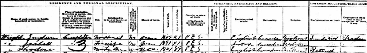 | Census | Richard Theodore Wright was head of the household in the census in 1901 in Lot 7, Prince County, Prince Edward Island, CanadaG. Enumerated in the household with Theodore (age 79), now widowed, were his son Ingham (age 41), his wife Isabel Walker (age 32) and their adopted daughter Minnie McCronin (age 13). Theodore and Ingham were farmers. The family religion was Methodist.3 1901 Canada Census, Lot 7, Prince County, Prince Edward Island. Household of Theodore Wright, his son Ingham, his wife Isabel Walker, their adopted daughter Minnie McCronin. |