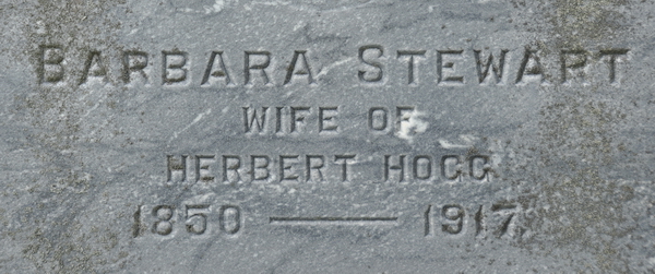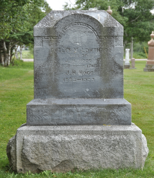Section D, Row 1, Stone 51.Inscription: Evelyn M. Lowther / Wife of / J. H. Hogg / 1888 - 1919 / J. H. Hogg / 1883 - 1923 / HOGGBack: Barbara Stewart / Wife of / Herbert Hogg / 1850 - 1917.5  Tombstone, Peoples Cemetery, Kensington, Prince County, Prince Edward Island, Canada. James Herbert Hogg (1883-1923), his first wife Barbara Stewart (1850-1917), his second wife, Evelyn Lowther (1888-1919).  Front inscription.  Back inscription.