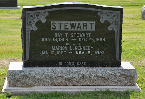 Inscription: STEWART / Ray T. Stewart / July 18, 1909 - Dec. 25, 1989 / His Wife / Marion L. Kennedy / Jan. 13, 1907 - Nov. 5, 1992 / In God's CareBack: STEWART.2  Tombstone, Ray Thomas Stewart (1909-1989), his wife Marion Leona Kennedy (1907-1992). The Peoples Cemetery, Kensington, Prince County, Prince Edward Island, Canada.