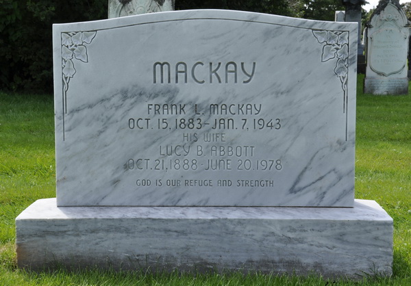 | Burial | He was buried in the Peoples Cemetery, Malpeque, Prince County, Prince Edward Island, Canada, 46.52979, -63.68686G. Inscription: MACKAY / Frank L. MacKay / Oct. 15, 1883 - Jan. 7, 1943 / His Wife / Lucy B. Abbott / Oct. 21, 1888 - June 20, 1978 / God is our refuge and strength.2![]() Tombstone, Frank L. MacKay 1883-1943, his wife Lucy B. Abbott (1888-1978). Peoples Cemetery, Malpeque, Prince County, Prince Edward Island, Canada. |